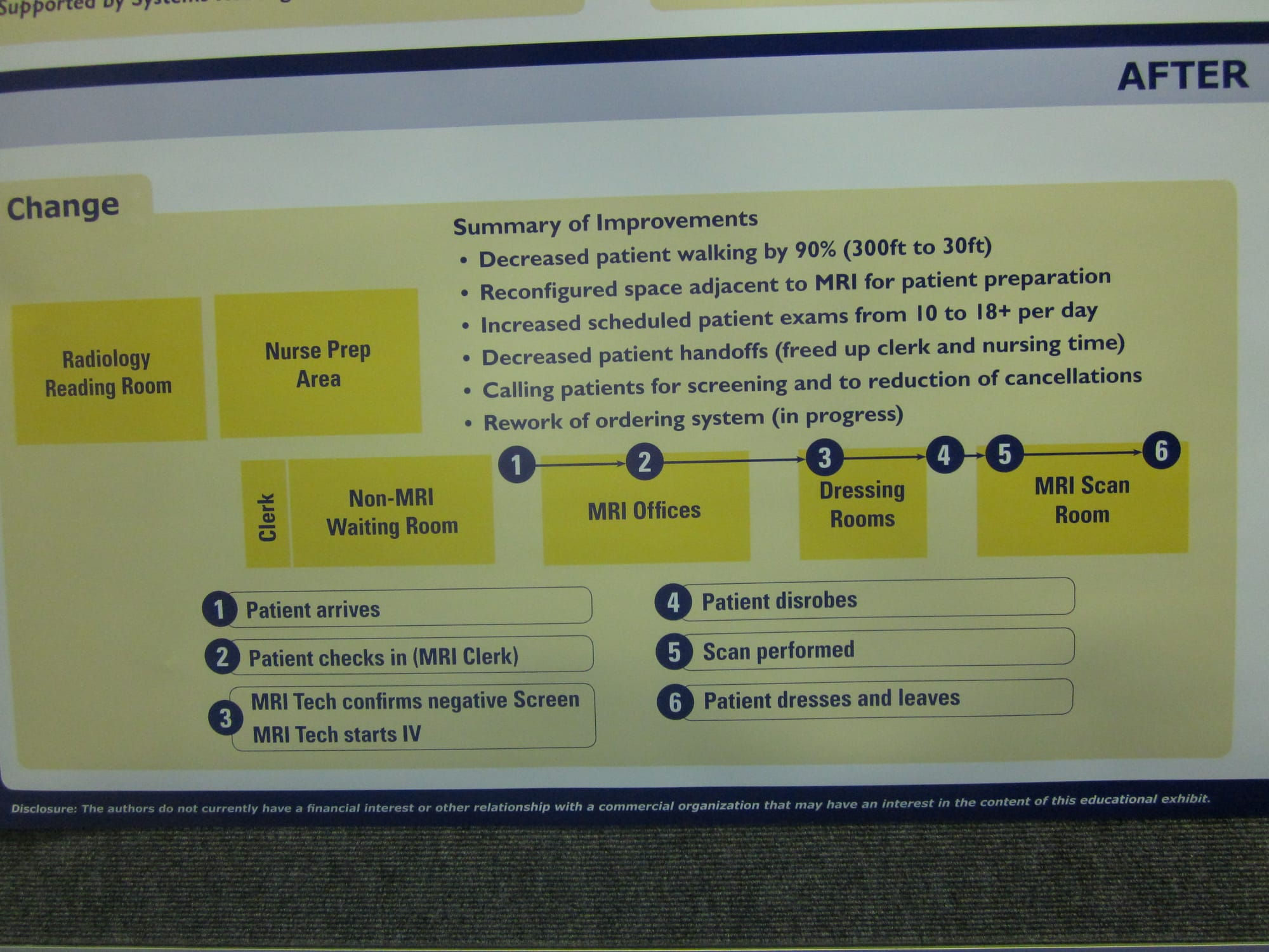 As with the previous post, this exhibit was associated with magnetic resonance imaging (MRI), not a surprise since RSNA is the Radiological Society of North America. While meaningful decreased cost was the eventual goal of this project, the end results provided a seemingly more pleasant hospital experience judging by the summary of improvements that the hospital provided.