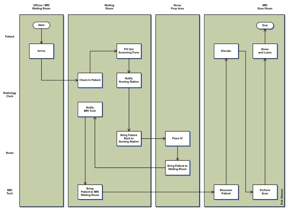The point of this post, however, is not to spend much time looking at quantifiable results (since no statistics were provided to enable looking at this aspect in sufficient detail), but investigating hospital presentation of the workflows, which in this case follow patients from the time they arrive to receive their MRI scan to the time they leave.