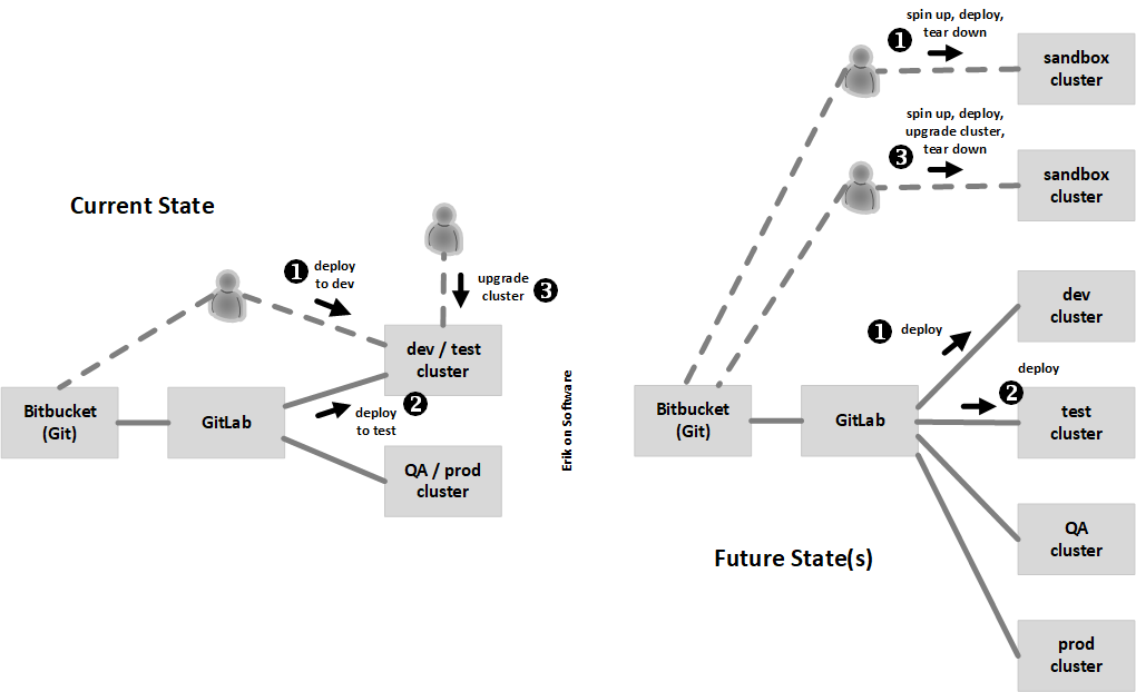 The nearby diagram on the left below illustrates the contention that can exist, with (1) the data engineering team looking to deploy to the dev environment, (2) the infrastructure team looking to upgrade the cluster for this same environment, and (3) GitLab deploying to the test environment residing on this same cluster. All of these activities make for both an unstable environment, as well as potential delays.