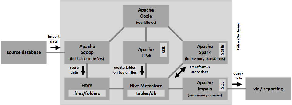 The nearby diagram below shows a very high level representation of what this looks like from the context of a use case involving ingestion of data from a source database, and consumption of data by visualization / reporting. The large light gray box is intended to represent a single cluster node, but since a cluster contains multiple nodes, and components are distributed across all of these, with a single node not being used for all components in every case, this is a very simplified representation to show how components relate to each other with respect to integration.