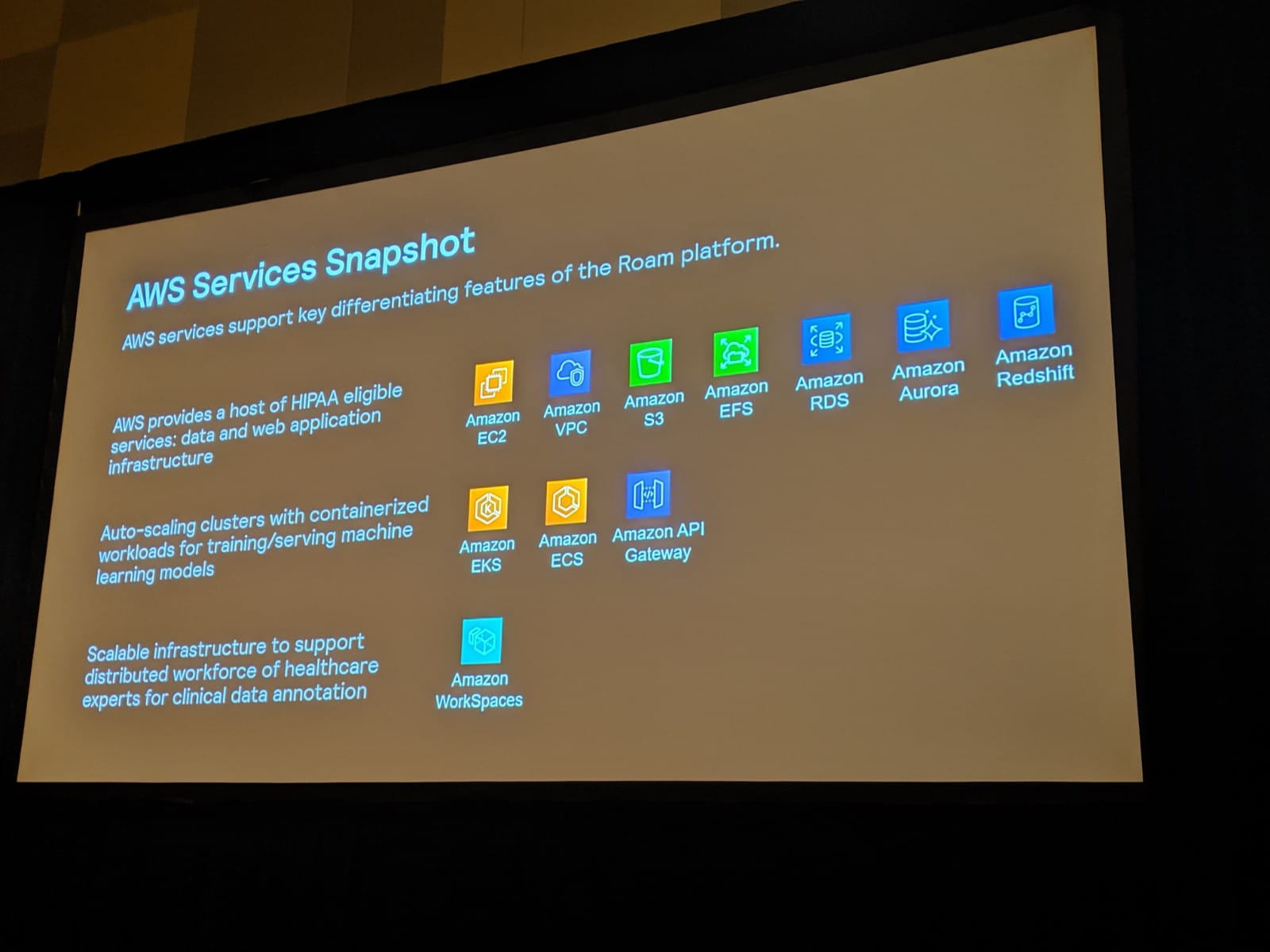 - Turkeltaub presented a diagram listing the AWS services they are using, but commented that the analytics is done within the Roam platform