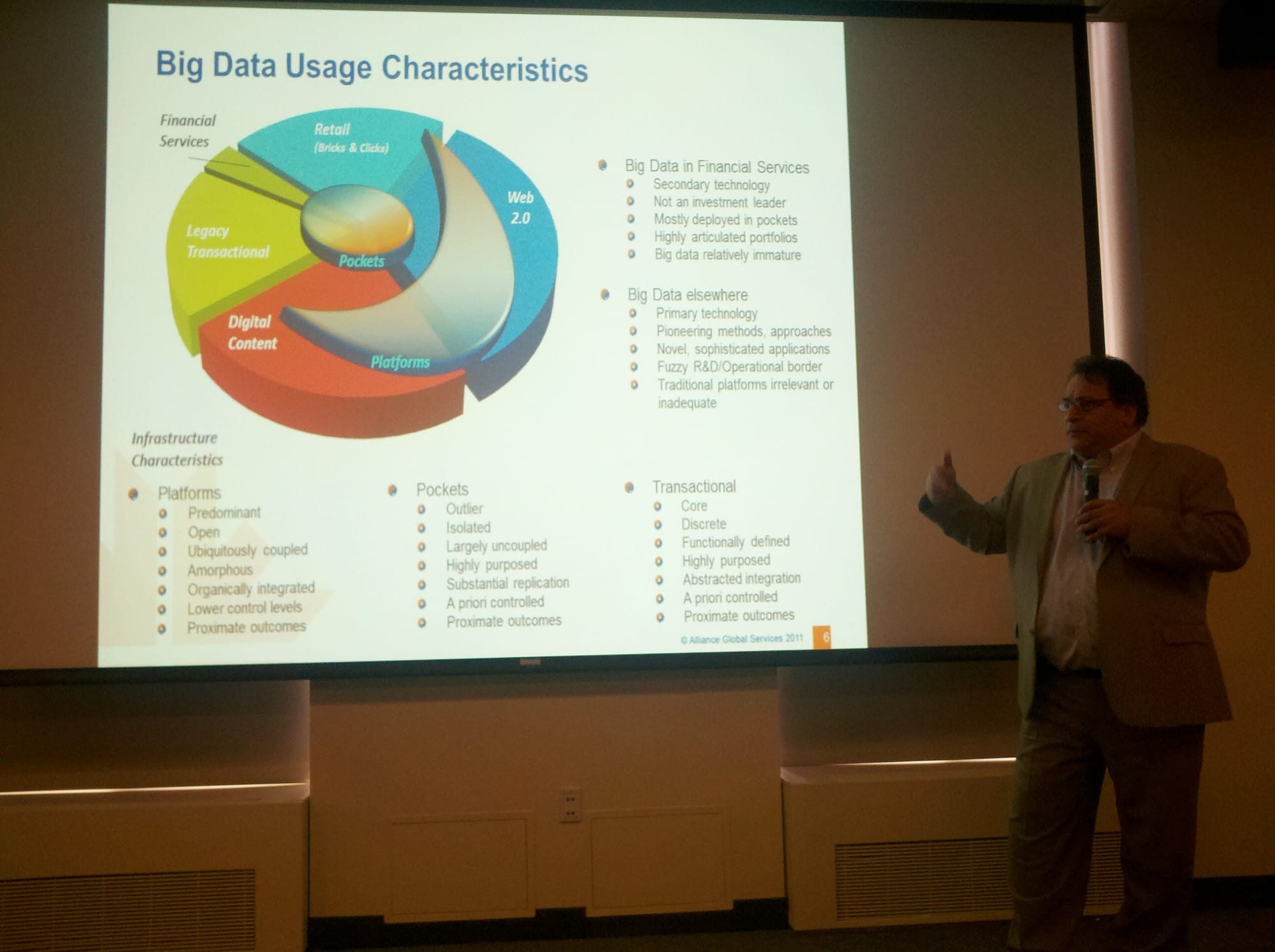 One attendee asked what has really changed, since finance has been working with significant amounts of data for quite some time. Shep responded by saying that what has changed is the sheer velocity and speed of data. Hadoop has become important because the amount of data has increased so rapidly. Shep argued that data is more or less random, and there are tests to determine the extend of randomness, but this is a topic that could consume an entire day in itself.