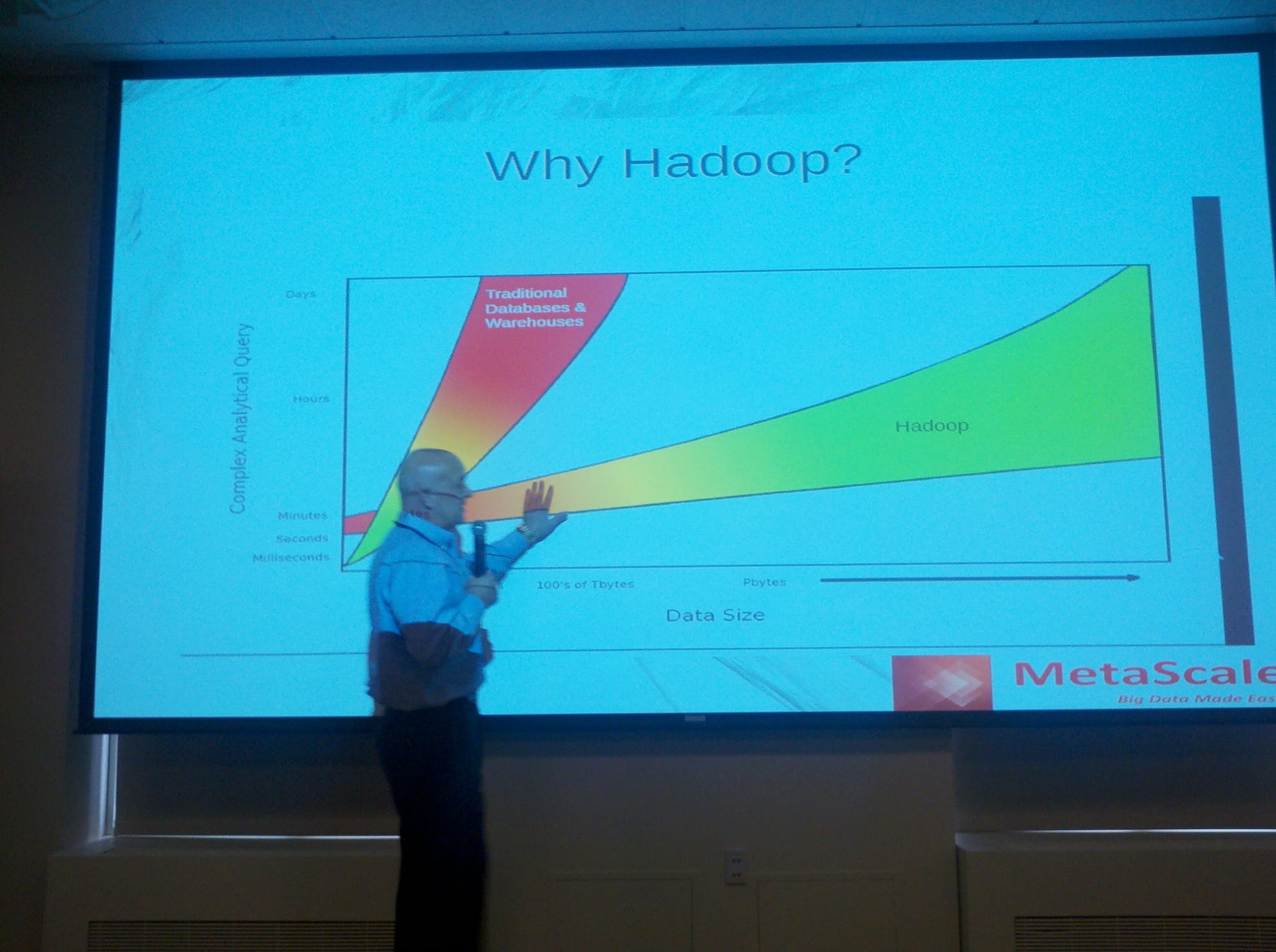 His group had to learn Hadoop on their own, because not a lot of books or training was available. This comment is similar to a comment that Shep made earlier, that a lot of the time problems he works on involve stuff being thrown at him that he is asked to just figure out. As a consultant, I can relate.