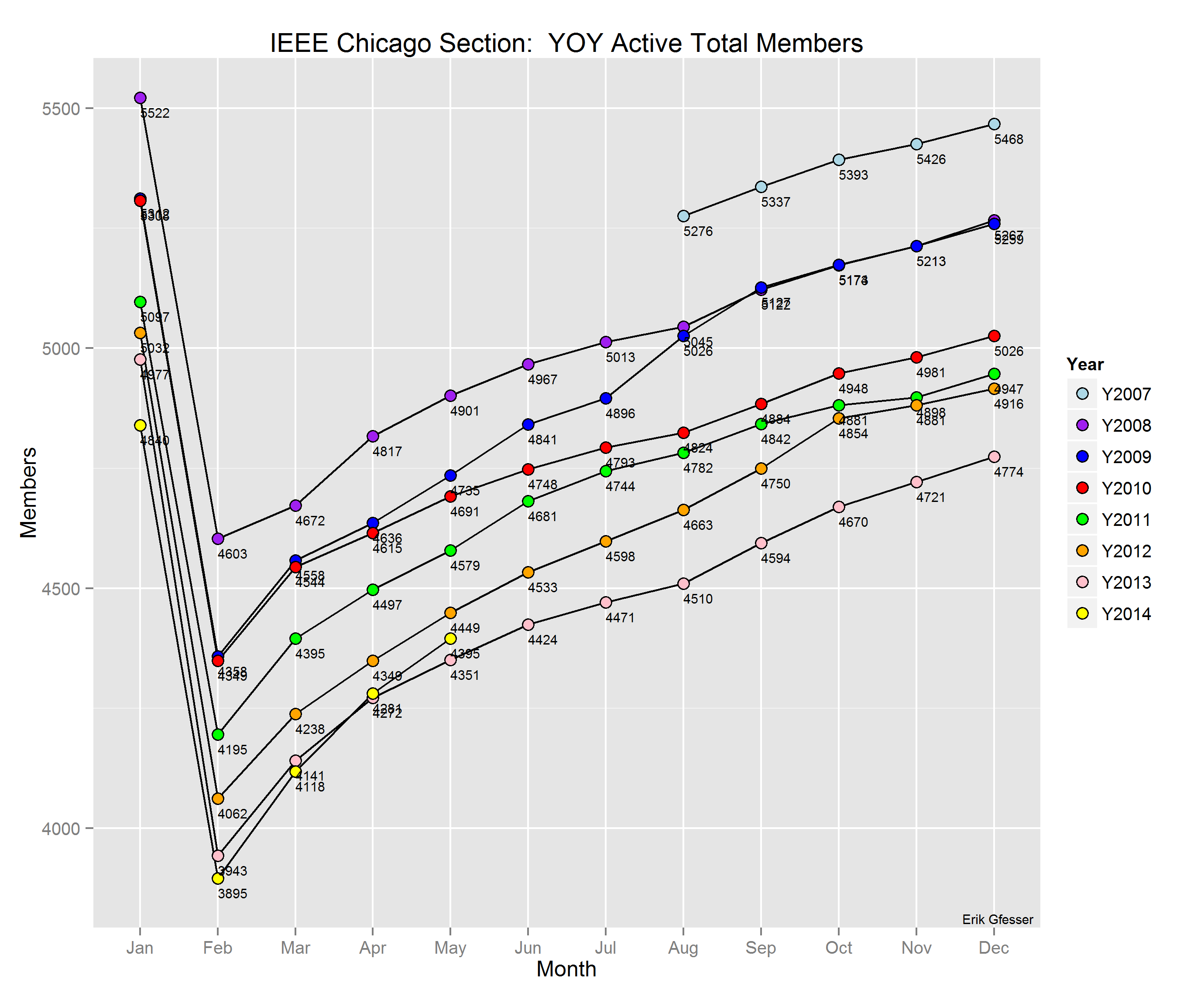 As explained to the new Section Chair/President, I could easily create what some might view as predictive graphs, such as trend lines etc, but I would be doing the Section a disservice by doing so, since these would not be accurate. In thinking about what helps predict future months, it really has a lot to do with individual members. It also has a lot to do with the economy and general industry trends, but these are fairly abstract concepts – even the government cannot predict unemployment rates and is always adjusting past months. In thinking about individual members – their demographics, education, fields of work, technical interests, etc – these are the core factors upon which models can be built to predict the types of individuals we are attracting and the types of individuals who choose to leave. Unfortunately, we do not have access to member credit ratings, but if we did, these might additionally help predict who will fail to keep up with their membership dues and go into arrears each year.