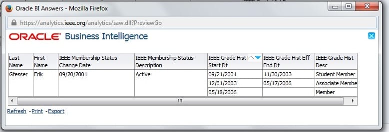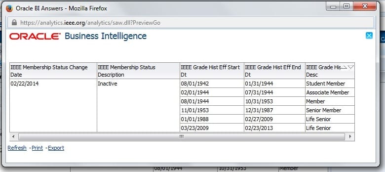 To provide readers a better understanding of the current state of the IEEE membership database, below are some screenshots of the Oracle Business Intelligence Enterprise Edition (OBIEE) 11g user interface. The first screenshot shows a small subset of the data available about me that is specific to historical member grade effective dates. Starting as a Student Member during graduate school, I was later elevated to Associate Member, Member, and most recently, Senior Member. The memberbership status field apparently indicates that I was in Active status during all of these time periods, with no other statuses.