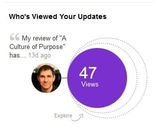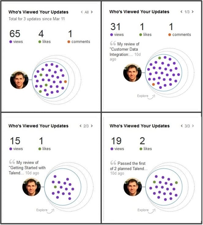 The above four screenshots, clockwise starting with the upper left screenshot, are intended to show who viewed three personal updates that had been shared in early March 2014. The first screen shot is a summary of the latter three screenshots, which are broken down by each individual update. Fortunately, the numbers add up. There were 65 total views by my connections of these updates (31 + 15 + 19 = 65), 4 total likes (1 + 1 + 2 = 4), and 1 comment. While this is basic math, notice that the plots that LinkedIn provides do not match these numbers. At some point, LinkedIn must have determined that there is a saturation point with the number of data points being depicted. Although this is a general observation, because this only seems to apply to the total number of views, note the number of likes and comments, which are accurate.