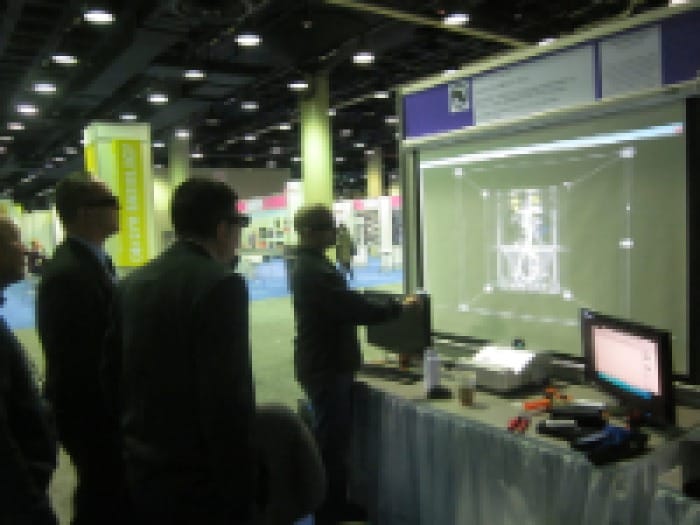 One of the best exhibits in my opinion was "PACS 3D: Utilizing Cutting-edge Technologies to Create a Fully Interactive 3D PACS Interface". (A complete list of research exhibits is available here in the "Education Exhibits" section.) I had a chance to chat with the researcher before the lines formed. He integrated a Wii into his software at some point (he's been working on this research for 6 years). The demonstration was fairly smooth, but he said the ambient light was interfering with the Wii. Essentially, what his software provides is the ability to examine an image, click on an individual anatomical part (which I think he referred to as "segmenting"), and drag and rotate the part in space away from the original image. No photo of me in glasses – sorry – but here is a photo of some physicians who arrived a few minutes after me.